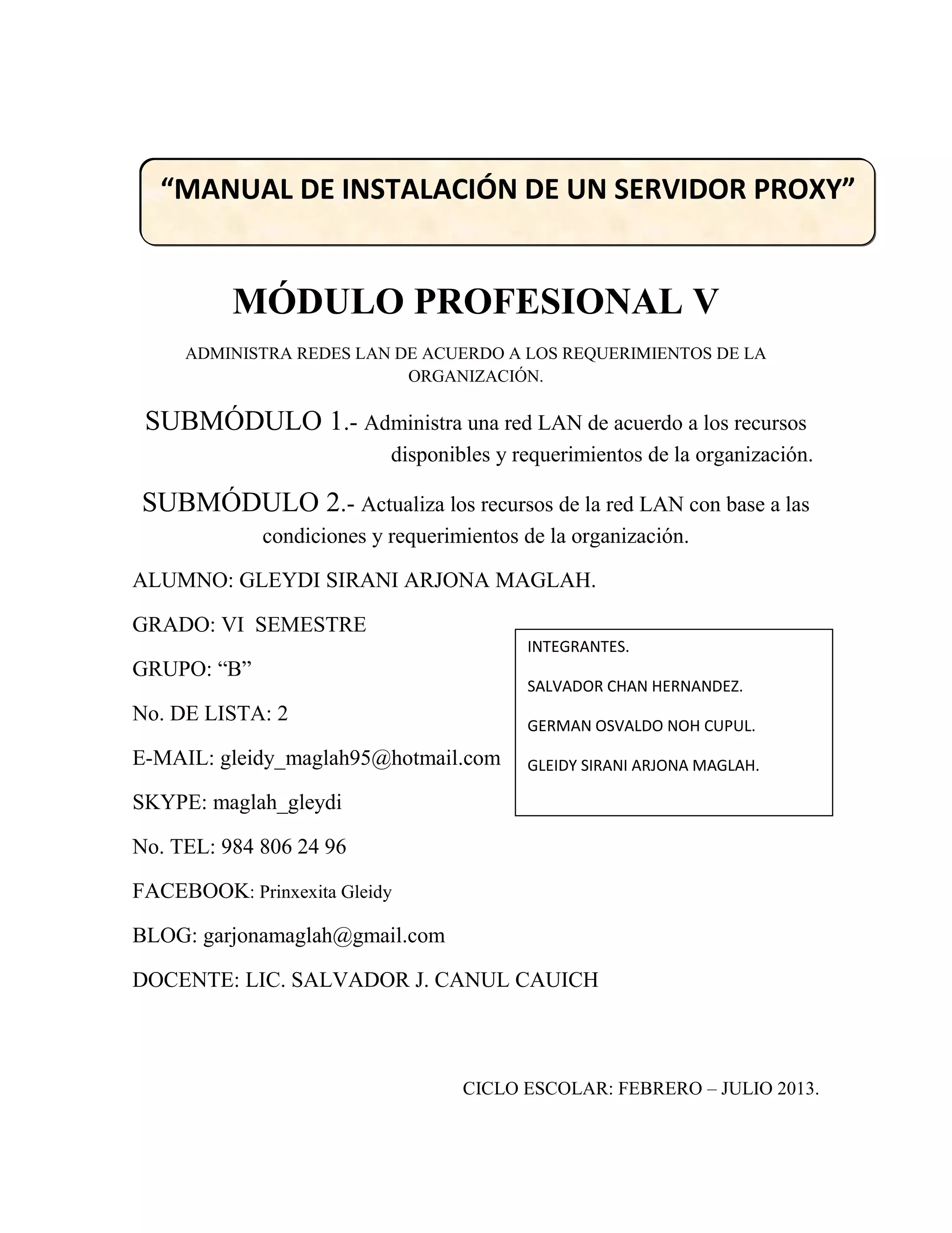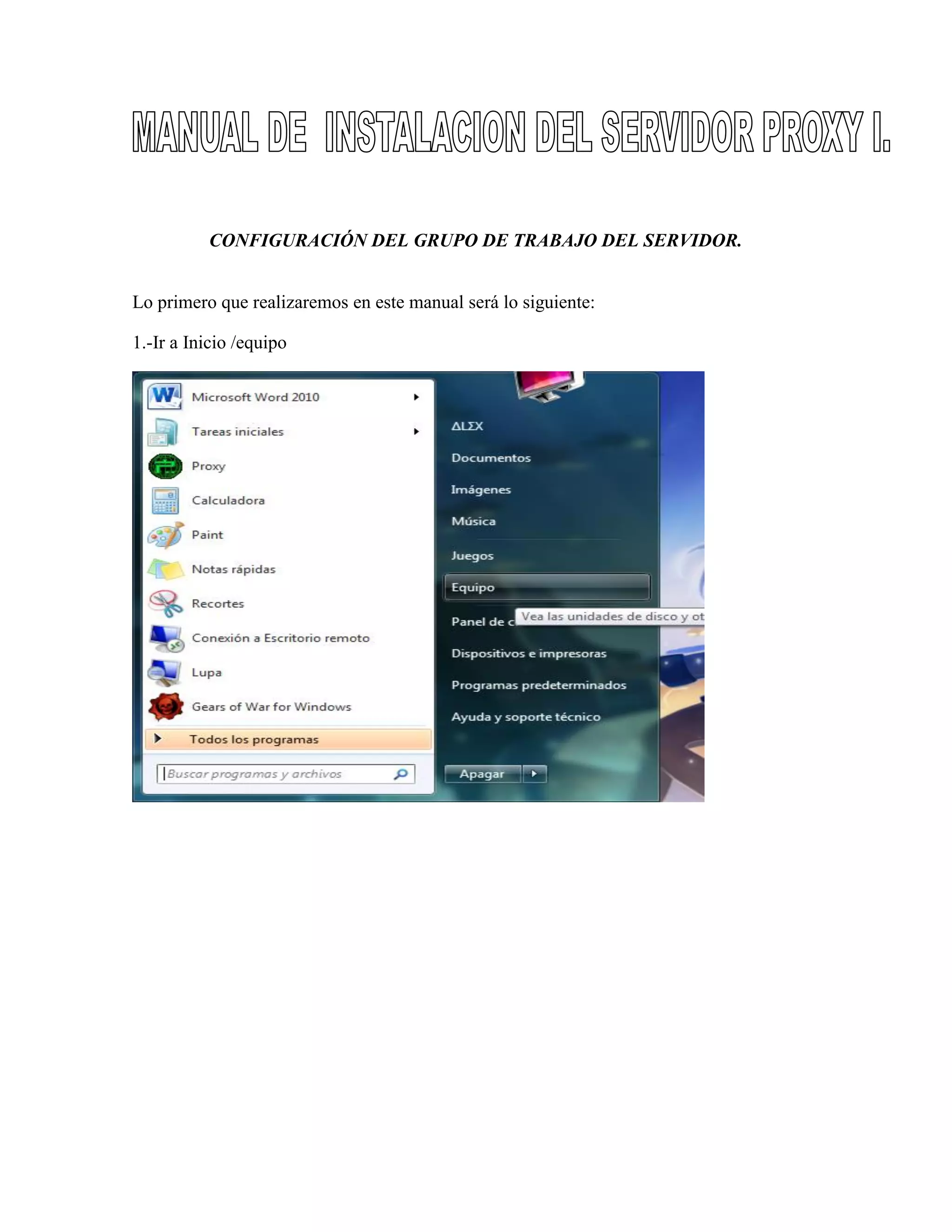 Este documento describe los pasos para configurar un servidor proxy en una red local. Explica cómo configurar el nombre del equipo y el grupo de trabajo, establecer la dirección IP, instalar el software proxy, y configurar los clientes para que usen el servidor proxy para acceder a Internet.