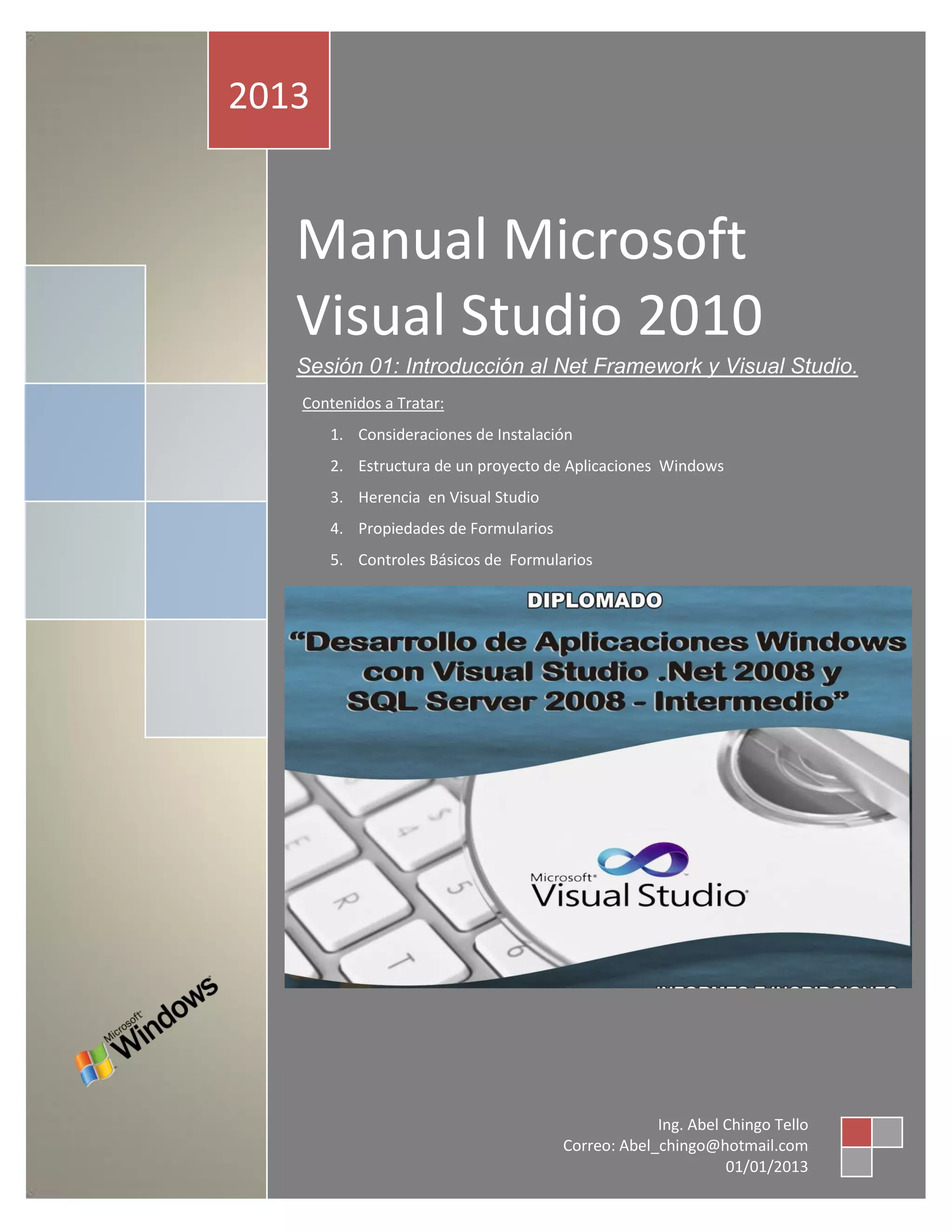 El documento proporciona una introducción a .NET Framework y Visual Studio. Explica que .NET Framework es un entorno de ejecución administrado que ofrece servicios como administración de memoria, tipos comunes, bibliotecas de clases y compatibilidad entre lenguajes. También describe Visual Studio como un conjunto de herramientas de desarrollo integradas que usan .NET Framework. Luego, resume consideraciones de instalación, la estructura de proyectos y formularios, y conceptos como herencia y controles básicos.
