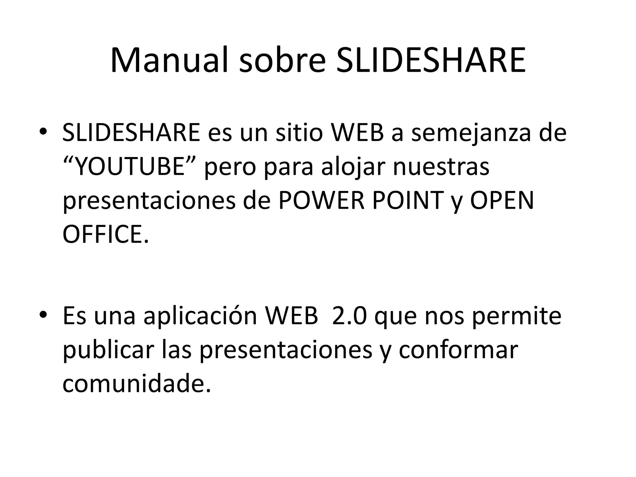 Este documento proporciona instrucciones en 10 pasos para publicar presentaciones de PowerPoint en SlideShare. SlideShare es un sitio web que permite a los usuarios publicar presentaciones y crear comunidades en torno a ellas. El documento explica el proceso de registro en SlideShare, cargar una presentación, personalizarla con un título y descripción, y copiar el código HTML para insertar la presentación en una página web.