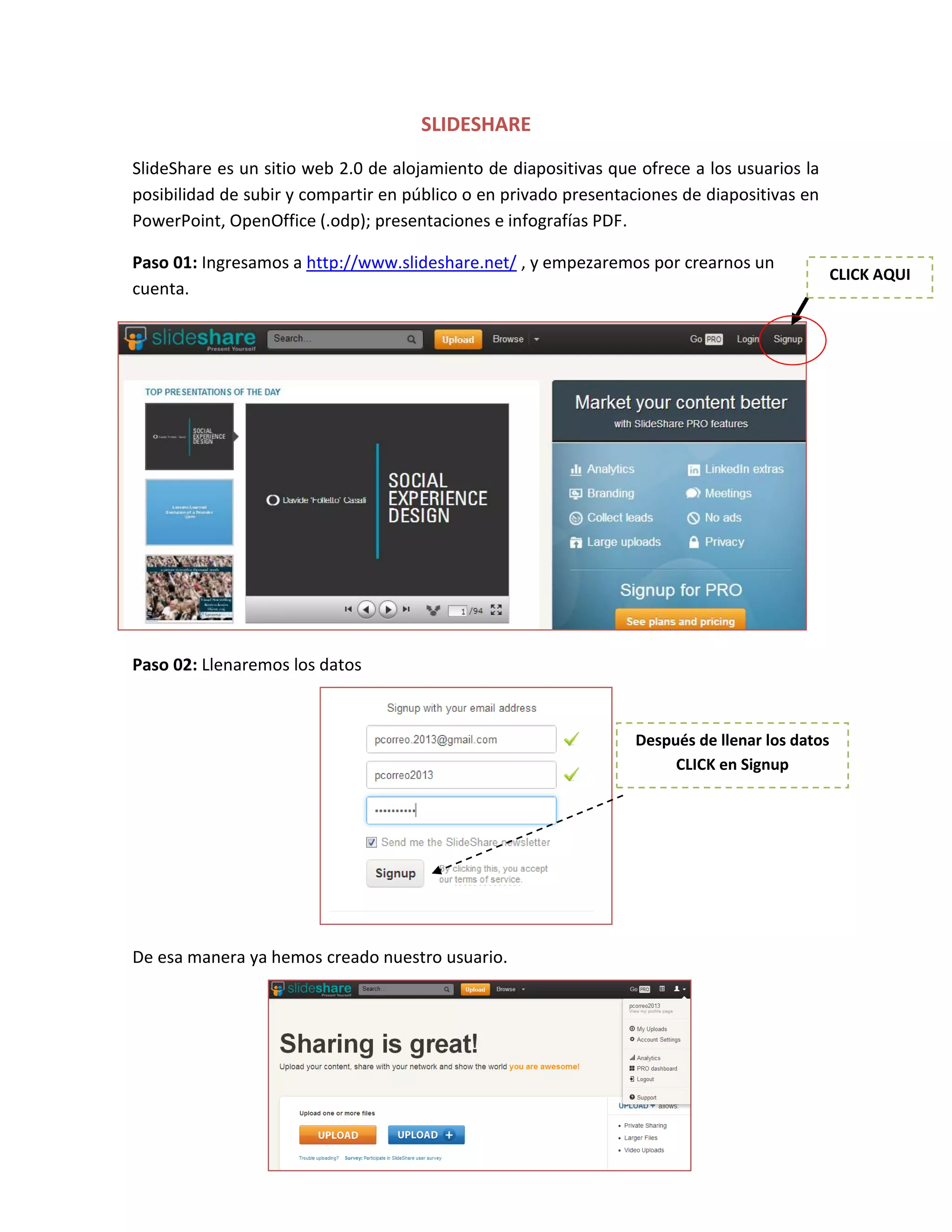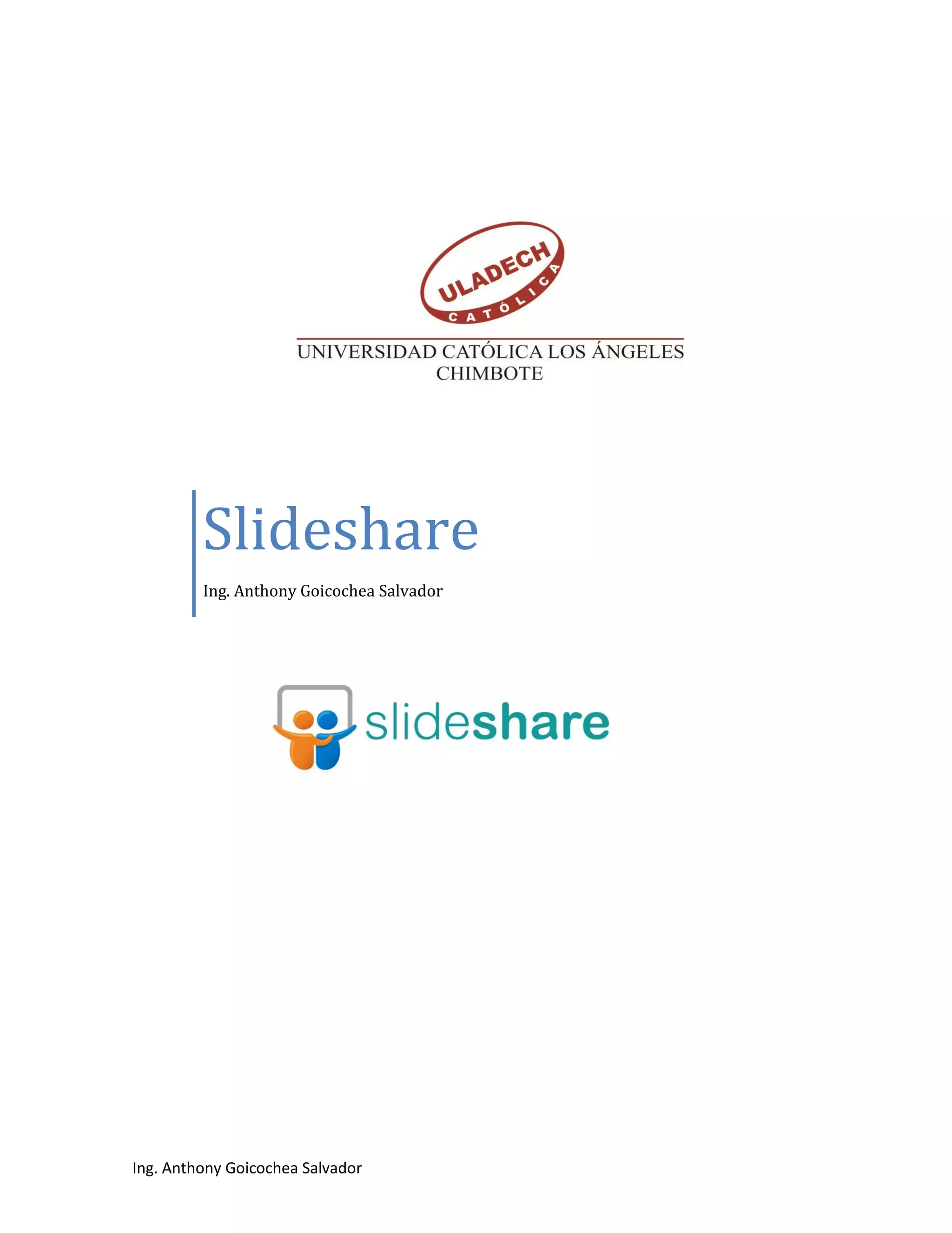 SlideShare es un sitio web que permite a los usuarios subir y compartir presentaciones de PowerPoint, OpenOffice y PDF de manera pública o privada. El documento explica los 5 pasos para crear una cuenta en SlideShare, subir una presentación al sitio y llenar los metadatos requeridos como título, descripción, tags y categoría para publicarla.