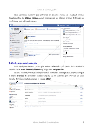 El manual de Facebook (2015) proporciona instrucciones sobre cómo configurar una cuenta, ajustar la privacidad, buscar amigos, compartir datos y fotos, y comunicarse con amigos a través de mensajes y chat. Los usuarios pueden modificar su configuración de privacidad y gestionar el contenido que comparten. Además, el documento detalla cómo desactivar la cuenta y las opciones para interactuar en la plataforma.