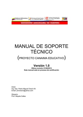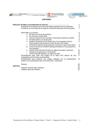 Este manual proporciona instrucciones para resolver problemas comunes en computadoras Canaima y crear imágenes de respaldo. Explica cómo reparar errores en el sistema de archivos, solucionar fallas luego de instalar contenido educativo, y clonar una computadora funcional en un disco duro externo para restaurar otras máquinas.