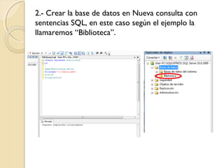 El documento describe los pasos para crear una base de datos para gestionar una biblioteca. Se identifican 4 tablas - Textos, Órdenes de solicitud, Lectores y Bibliotecarios - que almacenarán información sobre los textos de la biblioteca, las órdenes de préstamo, los datos de los lectores y bibliotecarios. Se explica cómo crear cada tabla especificando los atributos y tipos de datos de cada una.