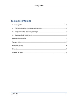 StickySorter es un software que permite crear notas digitales las cuales pueden ser organizadas por temas, colores o grupos. Las notas pueden ser creadas, modificadas y guardadas en formato CSV para su posterior edición. El programa contribuye al desarrollo de competencias como reconocer conceptos artísticos, conocer TIC y expresar ideas de forma oral o escrita.