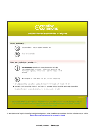 Este documento presenta un manual práctico sobre la Administración Electrónica. En la introducción, define la Administración Electrónica y explica sus objetivos, ventajas y características clave como la identificación, autenticación, integridad, confidencialidad, disponibilidad y conservación de la información. También incluye ejemplos destacados de servicios de Administración Electrónica en España.