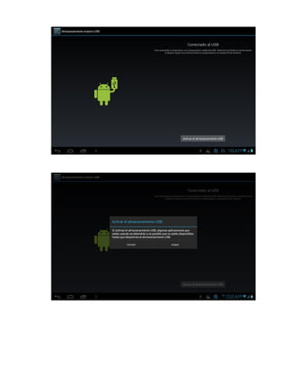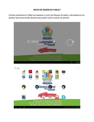 Este documento proporciona instrucciones sobre varias funciones básicas de una tableta Android, incluyendo cómo iniciar sesión, acceder a archivos, manipular archivos, conectarse a Internet, transferir archivos entre una tableta y PC, y tomar fotos y videos. Explica que para iniciar sesión solo se debe deslizar el bloqueo hacia la derecha, los archivos se almacenan en la carpeta "FileBrowser" y las unidades externas se muestran como opciones, y las fotos y videos se guardan de forma predeterminada en la carpeta "