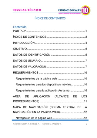 Este documento proporciona una guía técnica para el sitio web OaSociales. Incluye datos de identificación del sitio como el nombre, URL, autores y licencia. También describe los requisitos técnicos, el mapa de navegación, las secciones de la página y cómo funcionan los objetos de aprendizaje en dispositivos móviles a través de la aplicación Aurasma. El manual provee instrucciones detalladas para el uso y navegación del sitio web y los recursos educativos disponibles.