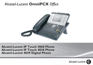 Este manual describe las funciones y características de los teléfonos IP Touch 4038 Phone, IP Touch 4068 Phone y 4039 Digital Phone de Alcatel-Lucent, incluyendo cómo realizar y recibir llamadas, transferir llamadas, configurar desvíos de llamadas, y usar funciones avanzadas como conferencias y mensajería. El manual también explica cómo personalizar la configuración de los teléfonos para adaptarse a las necesidades del usuario.
