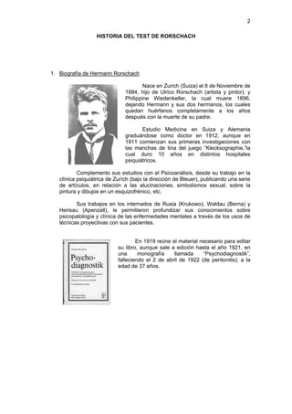 Este documento presenta una descripción del Test de Rorschach, incluyendo su historia, descripción, administración e instrucciones. El Test de Rorschach fue creado por Hermann Rorschach en 1921 y consta de 10 láminas ambiguas que se usan para evaluar la personalidad y procesos mentales de un individuo. El documento explica cada lámina y lo que evalúa, como sexualidad, afectos, angustia y pronóstico. También cubre las condiciones para aplicar el test, las instrucciones y cómo registrar las
