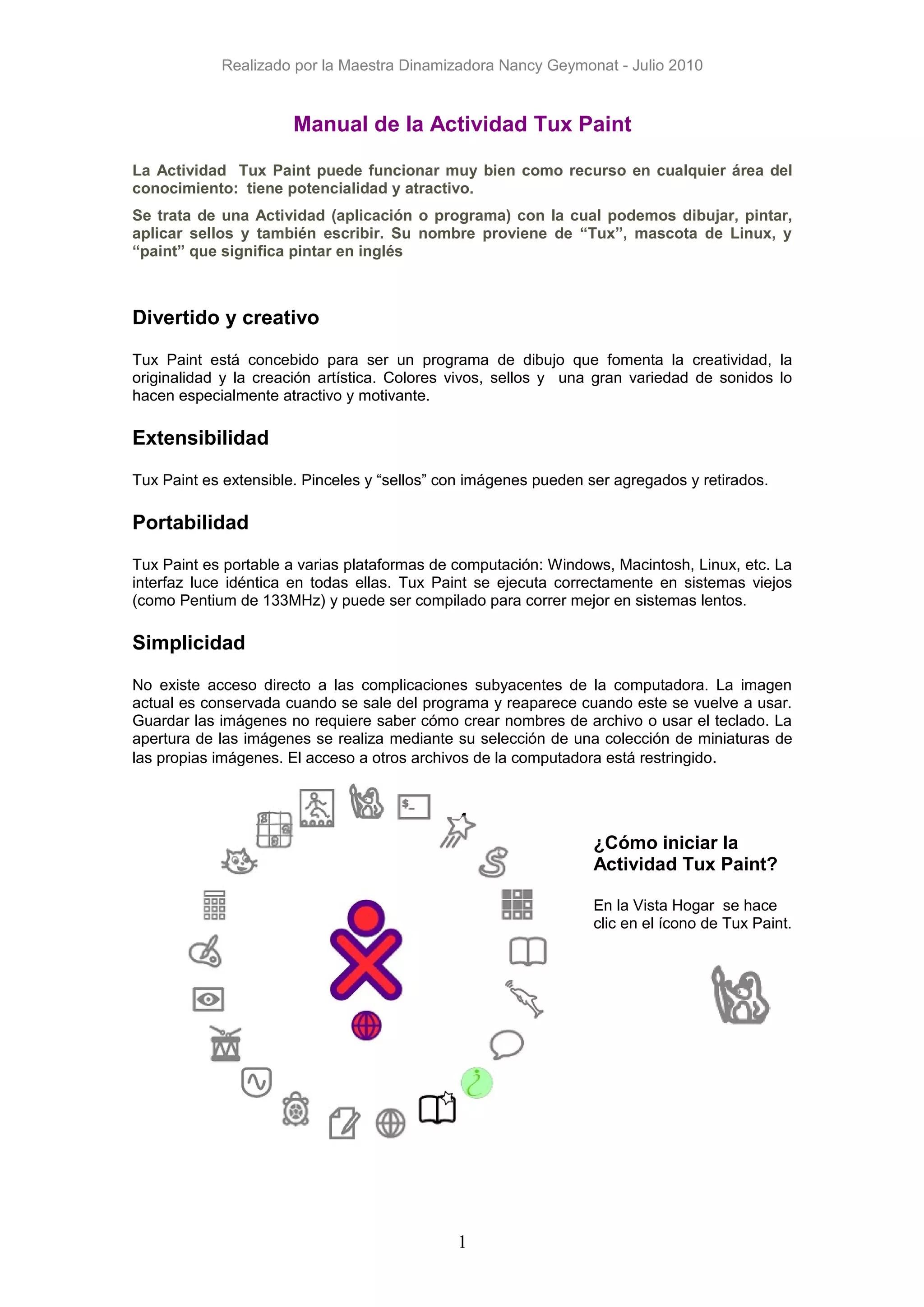 El documento proporciona información sobre el programa Tux Paint, un programa de dibujo gratuito y educativo para niños. Tux Paint permite a los usuarios dibujar, pintar y aplicar sellos de forma creativa. El programa es simple de usar, portable a diferentes sistemas operativos, y está diseñado para fomentar la creatividad de los niños a través de herramientas de dibujo, colores vibrantes y sonidos motivantes.