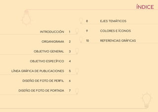 Este documento presenta las directrices de marca para una agencia de marketing digital llamada UIOCrea. Incluye su logotipo, objetivos generales y específicos, líneas gráficas para publicaciones en redes sociales, temas clave, colores y referencias visuales. El propósito es posicionar la marca y crear una imagen coherente para comunicarse de manera efectiva con sus audiencias.