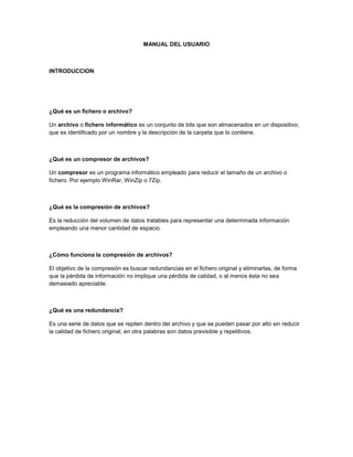 Este documento proporciona instrucciones sobre cómo comprimir y descomprimir archivos utilizando WinRAR. Explica que un compresor de archivos reduce el tamaño de los archivos al eliminar redundancias. Luego detalla los pasos para descargar e instalar WinRAR, comprimir un archivo seleccionando los archivos a comprimir y ajustar la configuración, y descomprimir un archivo extraído los archivos a la carpeta deseada. También cubre cómo enviar un archivo comprimido por correo electrónico y subirlo a un servidor de archivos.