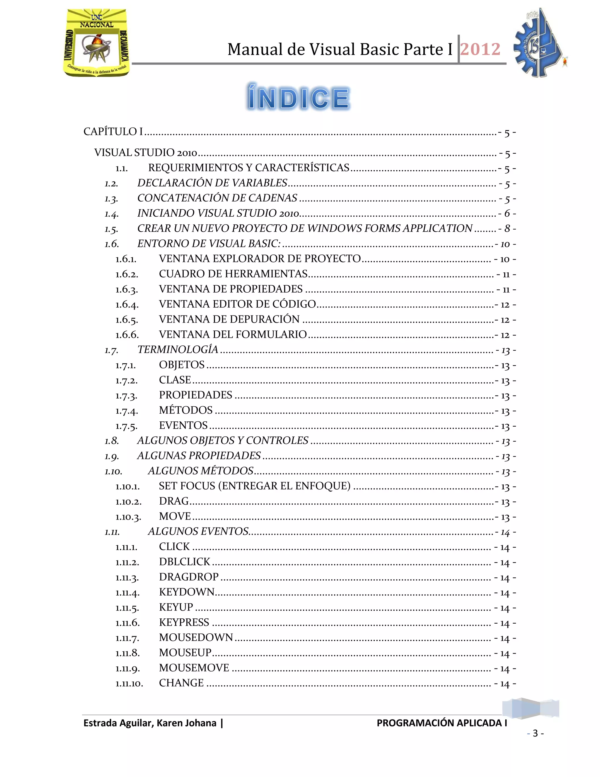 Este documento presenta un manual de Visual Basic Parte I. Explica cómo iniciar Visual Studio 2010 y crear un nuevo proyecto de Windows Forms Application. Luego describe el entorno de Visual Basic, incluyendo la ventana del Explorador de Proyectos, Cuadro de Herramientas, Ventana de Propiedades, Ventana del Editor de Código y más. También define conceptos clave como objetos, clases, propiedades, métodos y eventos. Finalmente, proporciona ejemplos de código para declarar variables, concatenar cadenas y usar estructuras selectivas como