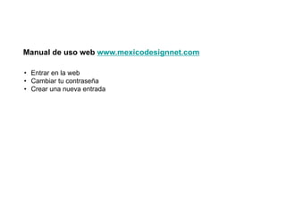 Este documento proporciona instrucciones para usar el sitio web www.mexicodesignnet.com, incluyendo cómo entrar al sitio web con una cuenta de usuario y contraseña provista por correo electrónico, crear nuevas entradas en la zona de administración cargando títulos, texto, imágenes y galerías, y cambiar la contraseña de acceso.