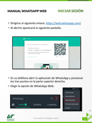 El documento proporciona instrucciones para usar WhatsApp Web. Explica cómo iniciar sesión escaneando un código QR desde el teléfono y crear grupos. También describe cómo enviar y acceder a archivos como fotos, videos, documentos y contactos dentro de chats individuales y grupales.