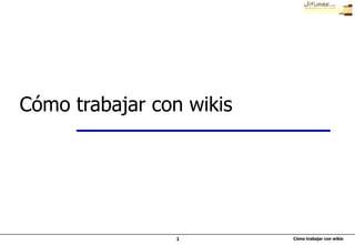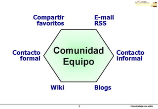 Este documento proporciona orientación sobre cómo crear y administrar un wiki. Explica los pasos iniciales de definir el objetivo, estructura y normas del wiki. También describe las características clave de un wiki como la edición y guardado de páginas, historial de versiones, y discusión asociada. Además, detalla cómo realizar tareas comunes como crear y editar páginas, añadir formato, imágenes e hipervínculos, y utilizar plantillas y widgets.