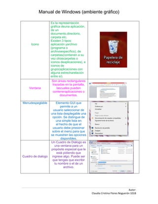 Este manual explica los elementos básicos del ambiente gráfico de Windows, como iconos, ventanas, menús desplegables y cuadros de diálogo. Describe elementos como el escritorio, la barra de tareas, el botón de inicio y las barras de desplazamiento. Además, define directorios, archivos y sus extensiones más comunes como .exe, .mp3, .wav, .avi, .gif y .jpg.