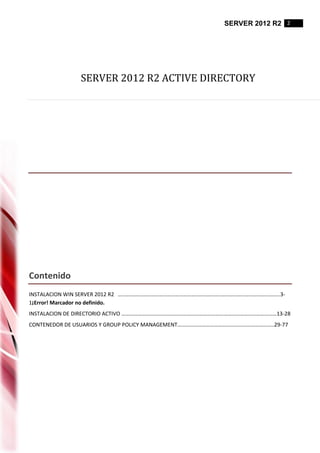 Este documento resume la instalación y configuración de Windows Server 2012 R2, incluyendo la instalación del sistema operativo, la configuración de Active Directory y DNS, la creación de contenedores de usuarios y grupos, y la implementación de políticas de grupo para administrar el acceso de usuarios y carpetas.