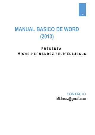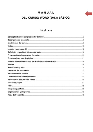 Este documento presenta un manual básico de Word 2013. Explica conceptos clave como el uso del ratón, teclado, ventanas y cuadros de diálogo. También describe las vistas disponibles en Word, los movimientos del cursor, e insertar y sobreescribir texto. El manual proporciona instrucciones detalladas sobre una variedad de herramientas y funciones de formato en Word.