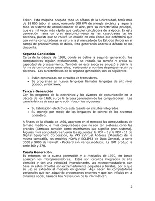 Este documento proporciona una introducción a la computación y Word básico. Explica la evolución de las computadoras a través de las generaciones, desde la primera generación de computadoras electrónicas hasta la cuarta generación de microprocesadores. También describe los componentes básicos de una computadora, la diferencia entre hardware y software, y conceptos clave como sistema operativo, Windows Vista, software libre y Linux. Finalmente, introduce la terminología básica del procesamiento de palabras.