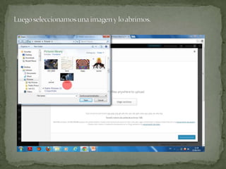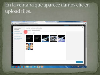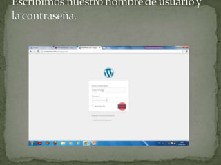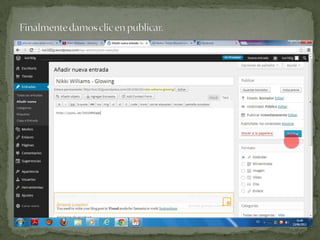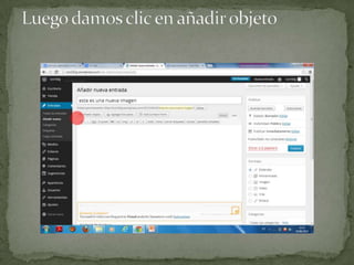 El documento proporciona instrucciones para agregar nuevas entradas de texto y publicar imágenes en un blog de WordPress. Para agregar una entrada de texto, se debe seleccionar la opción de entrada y luego nueva entrada en el menú de administración. Para publicar imágenes, se debe seleccionar entrada y luego añadir nueva entrada en el menú de administración.