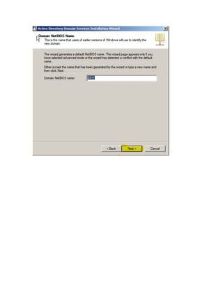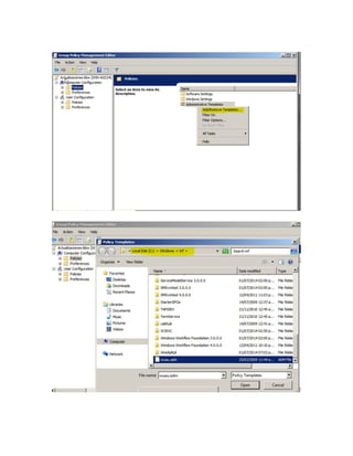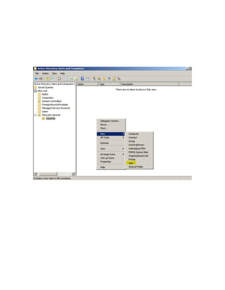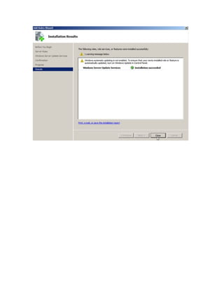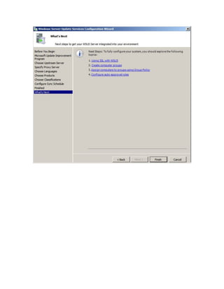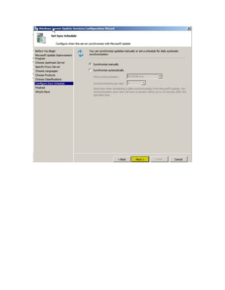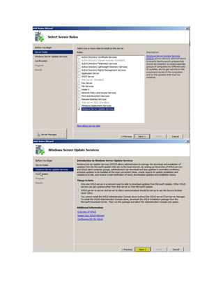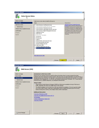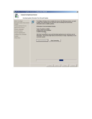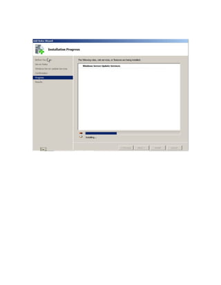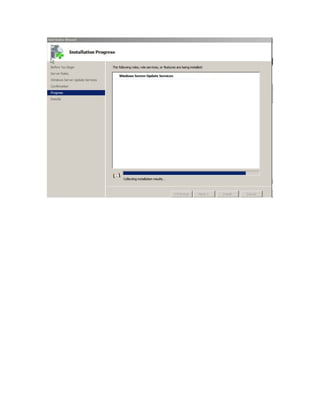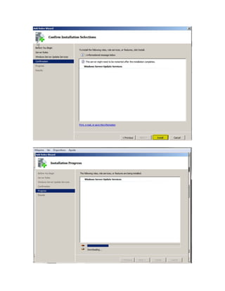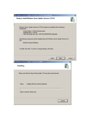 El documento proporciona instrucciones para instalar y configurar un servidor WSUS (Windows Server Update Services). Esto incluye configurar una IP estática en el servidor, instalar Active Directory, crear un dominio, instalar roles y dependencias de WSUS, configurar la sincronización con Microsoft Update, aprobar actualizaciones y configurar clientes para descargar actualizaciones desde el servidor WSUS.