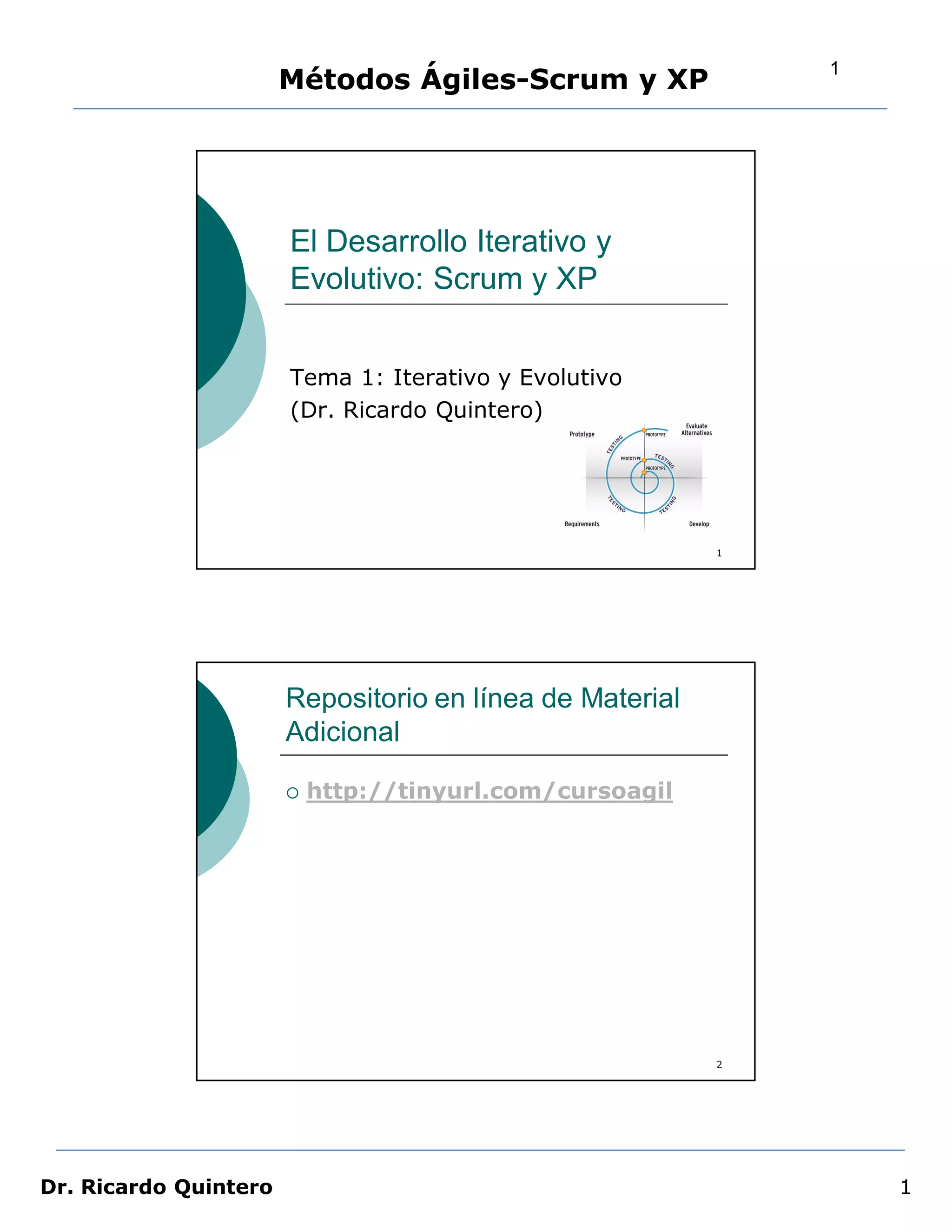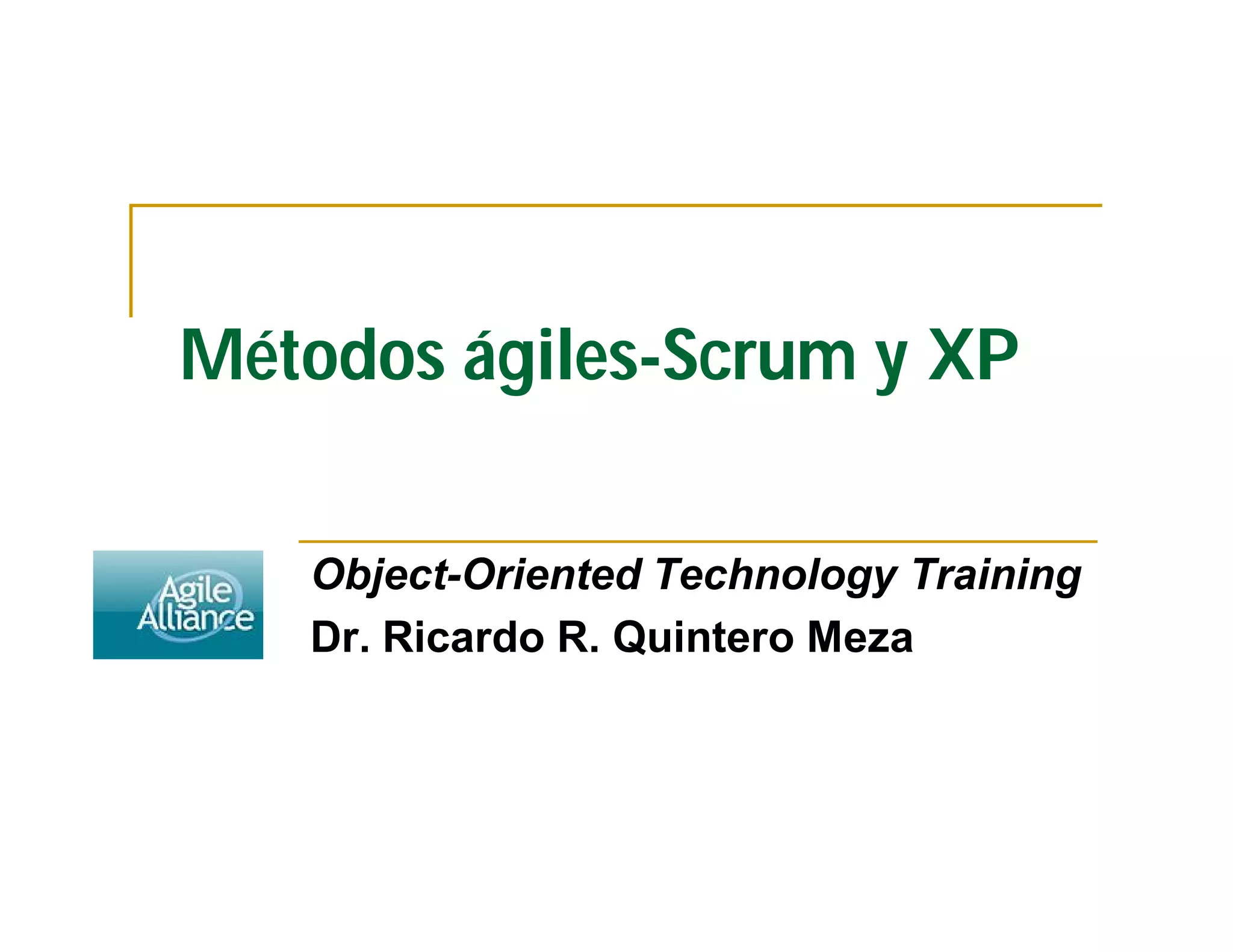 El documento describe los métodos ágiles Scrum y XP. Explica que el desarrollo de software es un proceso no predecible debido a la naturaleza cambiante de los requisitos. Por lo tanto, los métodos ágiles se basan en iteraciones cortas con entregas incrementales para hacer frente a la incertidumbre.