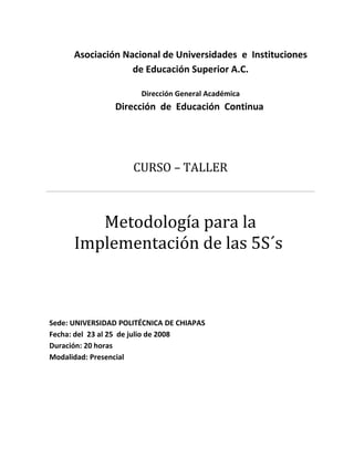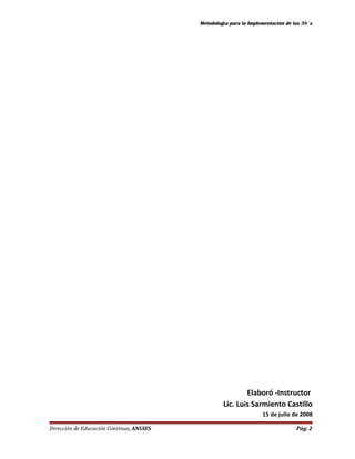 Este documento presenta la metodología para implementar las 5S (Seiri, Seiton, Seiso, Seiketsu, Shitsuke) en una organización. Explica que las 5S son una filosofía japonesa para establecer orden, limpieza y hábitos de trabajo. Detalla los pasos para la planificación y organización del proyecto de implementación, incluyendo la selección de áreas, formación de equipos, y calendarización de actividades. Finalmente, se enfoca en la primera S, Seiton, explicando cómo identificar y clasificar los elementos
