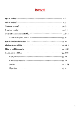 Este manual explica cómo crear y administrar un blog usando la plataforma Blogger de Google. En primer lugar, se describe brevemente qué es un blog y las características principales de Blogger. Luego, se explican los pasos para crear una cuenta de usuario, diseñar el blog inicialmente eligiendo una plantilla, y agregar las primeras entradas. Finalmente, se detallan las opciones para administrar el blog, como editar entradas, configurar aspectos del diseño y monetizar el blog a través de anuncios de AdSense.