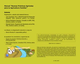 Este documento presenta el "Manual de Buenas Prácticas Agrícolas para la Agricultura Familiar" preparado por la FAO para América Latina y el Caribe. El manual tiene el objetivo de difundir los conceptos básicos de las Buenas Prácticas Agrícolas para orientar los sistemas de producción hacia una agricultura sostenible y mejorar las condiciones de vida de los agricultores familiares. El documento explica detalladamente cómo implementar las Buenas Prácticas Agrícolas en todas las etapas de la producción