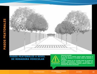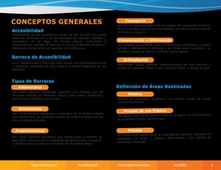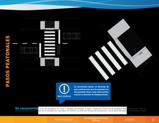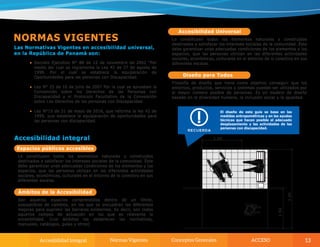 El documento habla sobre la importancia de diseñar espacios públicos y servicios urbanos de manera accesible e inclusiva para todas las personas, incluidas aquellas con discapacidad u otras limitaciones. Presenta el Manual de Acceso de la Secretaría Nacional de Discapacidad de Panamá, el cual establece pautas técnicas y científicas para facilitar el acceso a entornos físicos. El objetivo es promover el diseño universal y la eliminación de barreras arquitectónicas para lograr una sociedad más inclusiva.