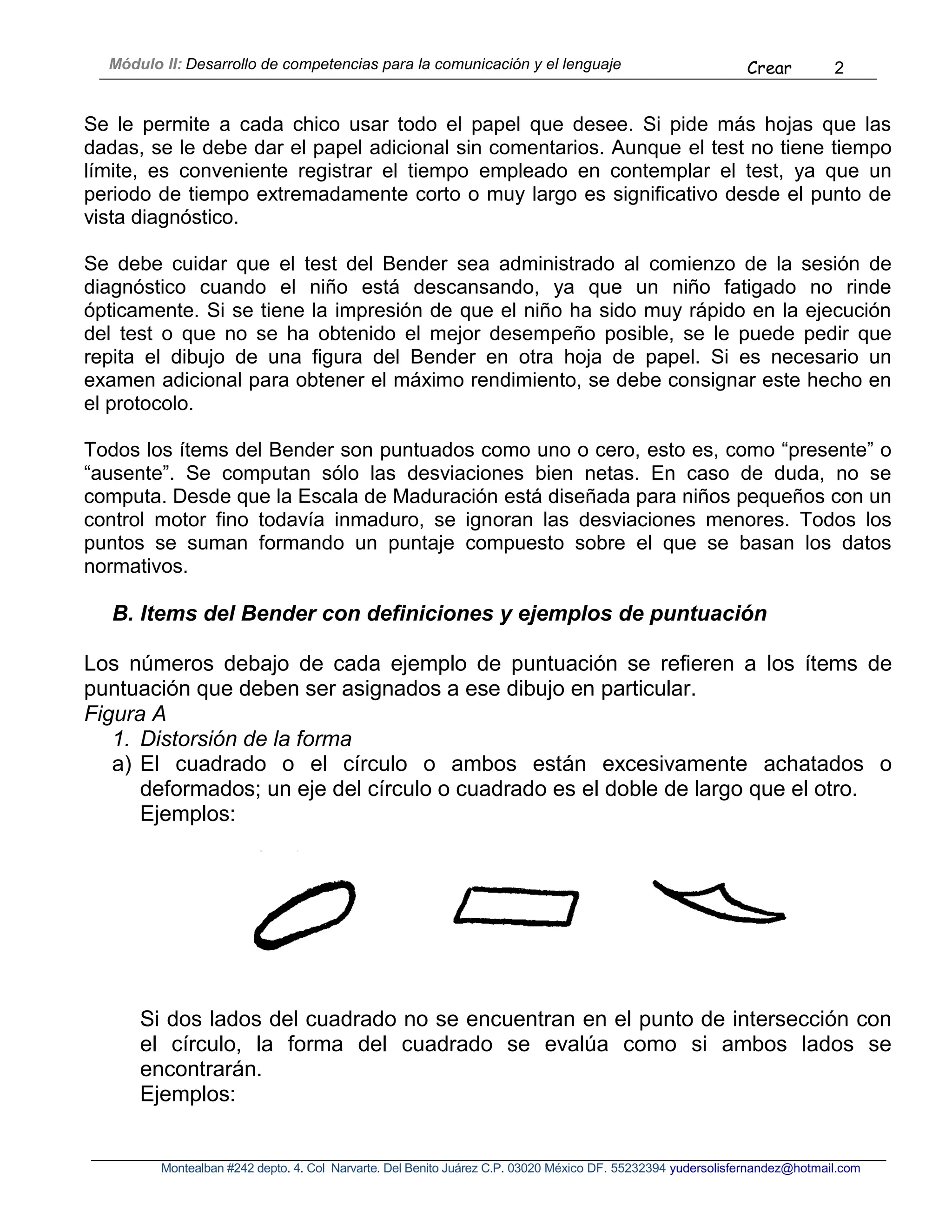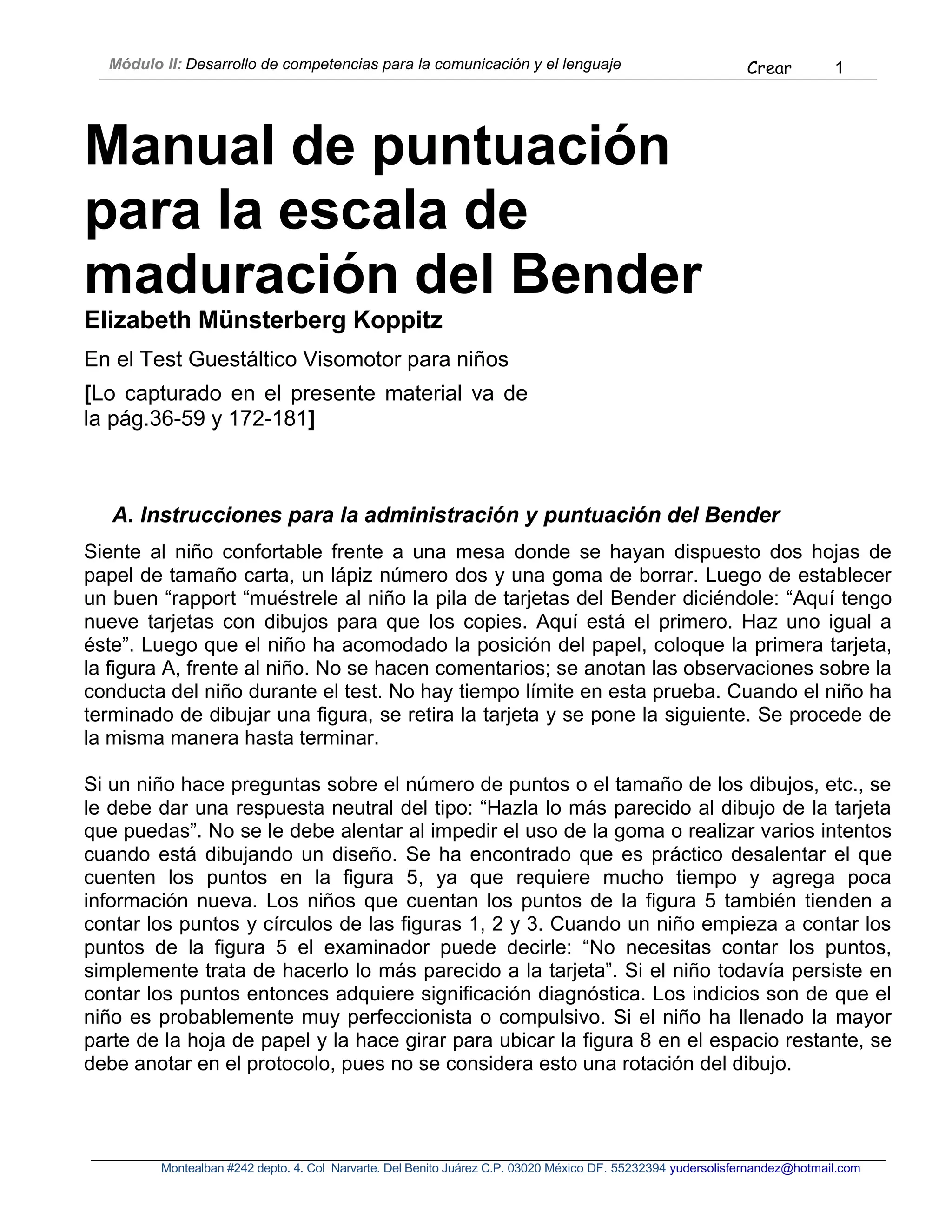 Este documento presenta las instrucciones para la administración y puntuación del Test Guestáltico Visomotor para niños de Bender. Explica cómo administrar el test, incluyendo mostrar las tarjetas una por una y permitir que el niño copie cada figura sin tiempo límite. También describe cómo puntuar cada figura, asignando valores de 0 o 1 para desviaciones en la forma, rotación, integración y perseveración. El objetivo es obtener un puntaje total que se puede usar para evaluar el nivel de maduración visomotora del niño.