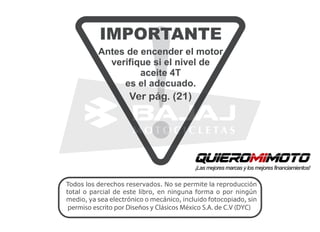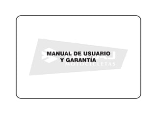 Este documento es el manual de usuario y garantía de una motocicleta producida por Diseños y Clásicos México S.A. de C.V. (DYC). Proporciona información sobre el manejo seguro y el mantenimiento adecuado de la motocicleta, incluidas recomendaciones para el período de asentamiento, consejos para el ahorro de combustible, el programa de mantenimiento periódico y la garantía del fabricante. También incluye secciones sobre la identificación de partes, especificaciones técnicas y los centros