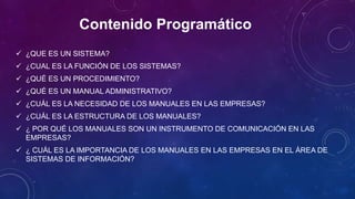 Este documento presenta una introducción a los sistemas, procedimientos y manuales administrativos. Explica que un sistema es un conjunto de funciones que operan con un propósito común y que los procedimientos son métodos para llevar a cabo tareas. Define un manual administrativo como un documento que concentra elementos administrativos para orientar a los empleados. Finalmente, destaca la importancia de los manuales para comunicar información de forma unificada y evitar errores en los sistemas de información de una empresa.
