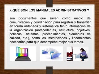 Este documento define los manuales administrativos como documentos que registran y transmiten información sobre la organización de manera ordenada para facilitar el desempeño de tareas. Explica que existen diferentes tipos de manuales clasificados por área de aplicación, contenido y ámbito. También describe los objetivos de los manuales y algunos tipos comunes como los manuales de procedimientos, puestos y funciones, políticas y organización.