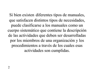 El documento describe los manuales administrativos y sus características. Los manuales son herramientas que facilitan el desarrollo de funciones administrativas y operativas en las organizaciones. Contienen la descripción de actividades y procedimientos que deben seguir los miembros de una organización. Ofrecen ventajas como sistematizar la gestión, mantener la continuidad y homogeneidad de los procesos, y facilitar el control y la toma de decisiones.