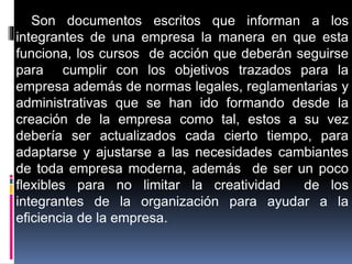 El documento habla sobre los manuales administrativos de una empresa. Explica que los manuales administrativos informan sobre cómo funciona la empresa, establecen normas y procedimientos, y deben actualizarse periódicamente. También describen los objetivos de los manuales como fijar políticas, definir funciones y responsabilidades, y aumentar la eficiencia. Luego discute las limitaciones como los altos costos y la posible rigidez. Finalmente, clasifica los diferentes tipos de manuales y explica el proceso de elaboración.