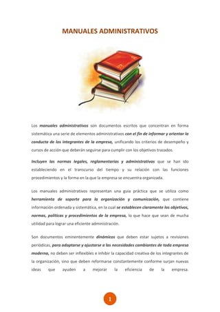 Este documento describe los manuales administrativos, incluyendo su definición, objetivos y clasificaciones. Explica que los manuales administrativos son documentos que sistematizan la información administrativa de una empresa para orientar el desempeño de sus empleados. Se clasifican en manuales de organización, normas y procedimientos, y puestos y funciones. Los manuales ayudan a estandarizar los procesos y definir roles y responsabilidades dentro de una empresa.