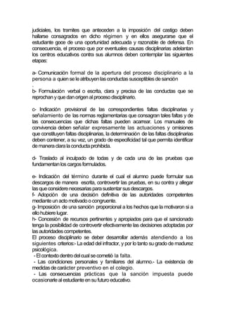 El documento discute los principios que deben regir los manuales de convivencia de las instituciones educativas. Estos manuales deben someterse a la constitución y respetar los derechos fundamentales de los estudiantes. Asimismo, deben establecer un debido proceso para imponer sanciones disciplinarias que incluya la comunicación formal de cargos, pruebas, derecho a la defensa y recursos. El documento también clasifica las faltas por nivel de gravedad y establece atenuantes y agravantes para determinar sanciones