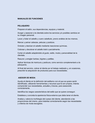 Este documento describe las funciones de varios roles en un salón de belleza. Los roles incluyen peluquero, asesor de moda, cajero, contador, administrador y servicio general. Los peluqueros preparan el salón y atienden clientes proveyendo servicios como cortes de cabello, tintes y tratamientos. Los asesores de moda ayudan a los clientes a definir su estilo. Los cajeros manejan transacciones monetarias. Los contadores realizan tareas contables y fiscales. Los administradores coordinan