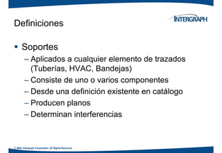 Este documento describe los soportes en el software Intergraph Process Power Marine. Explica que los soportes se aplican a elementos de trazado como tuberías y bandejas para soportarlos en objetos como vigas y pilares. Describe dos tipos de soportes: estándares, que son predefinidos y asociativos, y de diseño, que permiten modificar piezas individuales. También explica cómo posicionar soportes usando estructuras o puntos y cómo modificar propiedades de soportes y piezas.