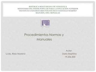 Este documento define procedimientos, normas y manuales. Explica que un procedimiento es una serie de pasos para llevar a cabo las actividades administrativas de una organización, y que las normas establecen las reglas para regular dichas actividades. Indica que un manual es un documento que sistematiza información administrativa para orientar el desempeño del personal de acuerdo a los objetivos de la empresa. Además, resume la estructura típica de un manual y cómo este sirve como instrumento de comunicación interna.