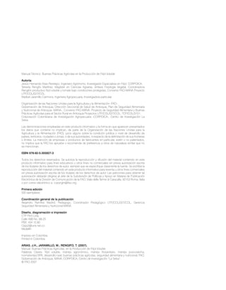 Este manual técnico describe las buenas prácticas agrícolas para la producción de fríjol voluble en Antioquia, Colombia. El documento comienza con una introducción a las BPA y su importancia. Luego cubre temas como variedades de fríjol, siembra, fertilización, riego, manejo de plagas y enfermedades, cosecha y poscosecha. El objetivo es promover prácticas sostenibles que mejoren la seguridad alimentaria y la calidad de vida de los agricultores.