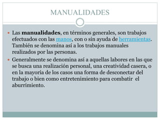 Las manualidades son trabajos realizados con las manos, ya sea solos o con herramientas, que buscan la creatividad, la realización personal y el entretenimiento. Generalmente se usan para desconectar del trabajo o combatir el aburrimiento. La decoración se refiere al proceso y resultado de adornar un espacio, como una casa u oficina, así como también al conjunto de elementos que adornan un ambiente.