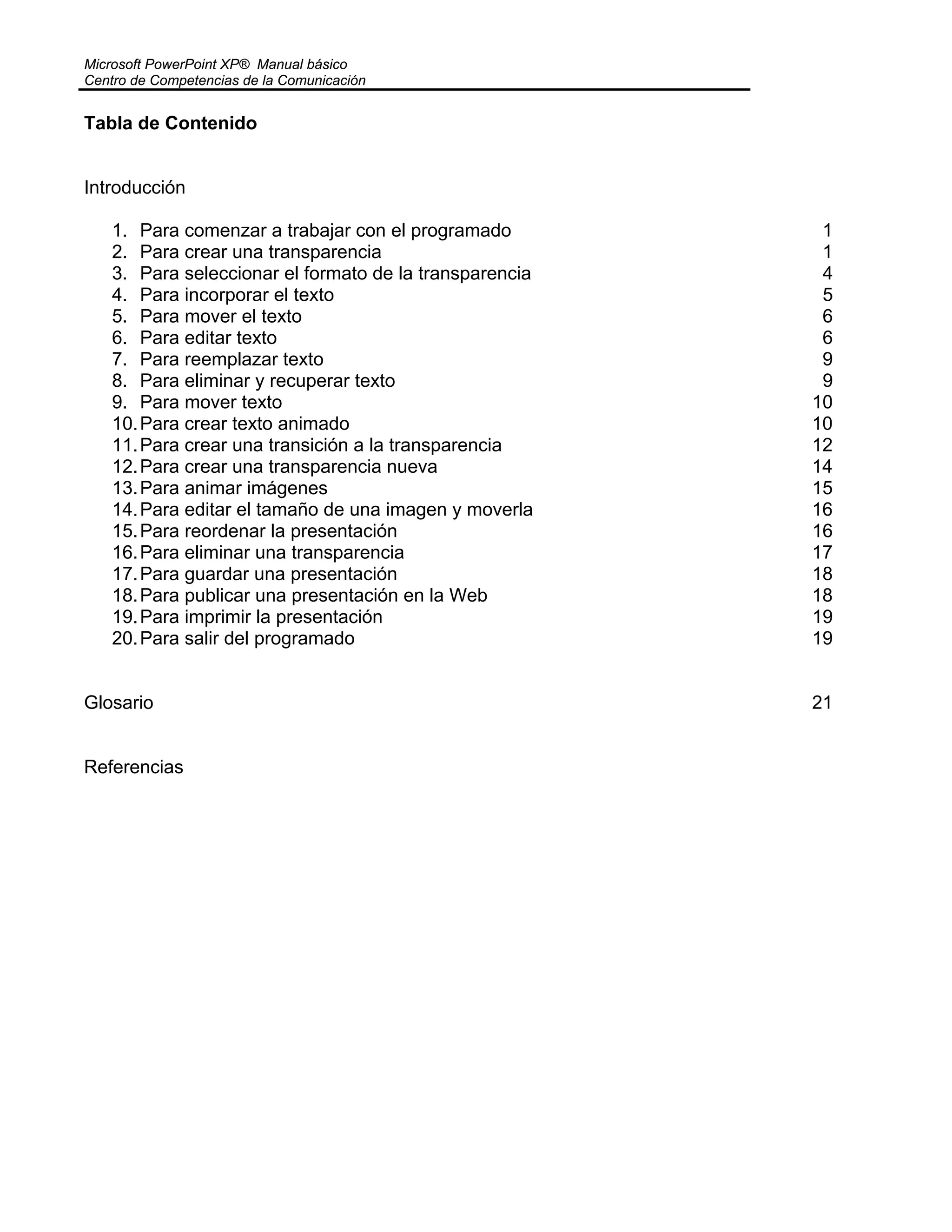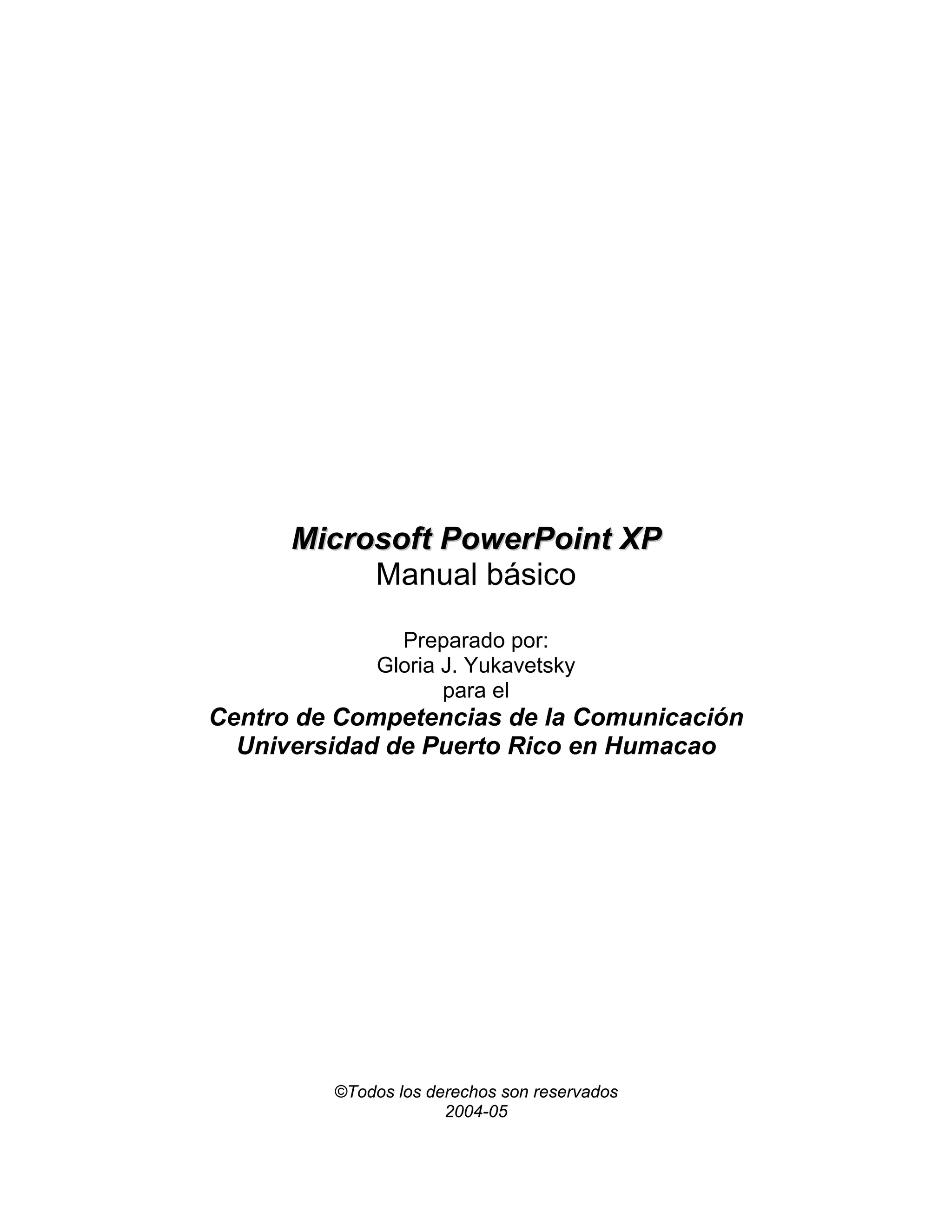 Este documento presenta un manual básico para el uso del programa Microsoft PowerPoint XP. Incluye instrucciones para crear y formatear diapositivas, incorporar y editar texto e imágenes, agregar transiciones y animaciones, y guardar y publicar presentaciones. El manual contiene 21 secciones con pasos detallados para realizar estas tareas comúnmente usadas en PowerPoint.