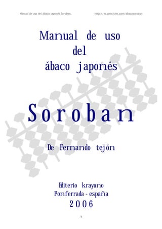 El manual de uso del ábaco japonés soroban, escrito por Fernando Tejón en 2006, ofrece una guía completa sobre su uso, resaltando las ventajas del ábaco en la agilidad mental y la concentración. Detalla la historia de este instrumento y expone sus principios de operación, incluyendo instrucciones para realizar cálculos matemáticos básicos como suma, resta, multiplicación y división. El documento también incluye ejemplos prácticos y ejercicios para mejorar la destreza en el uso del soroban.