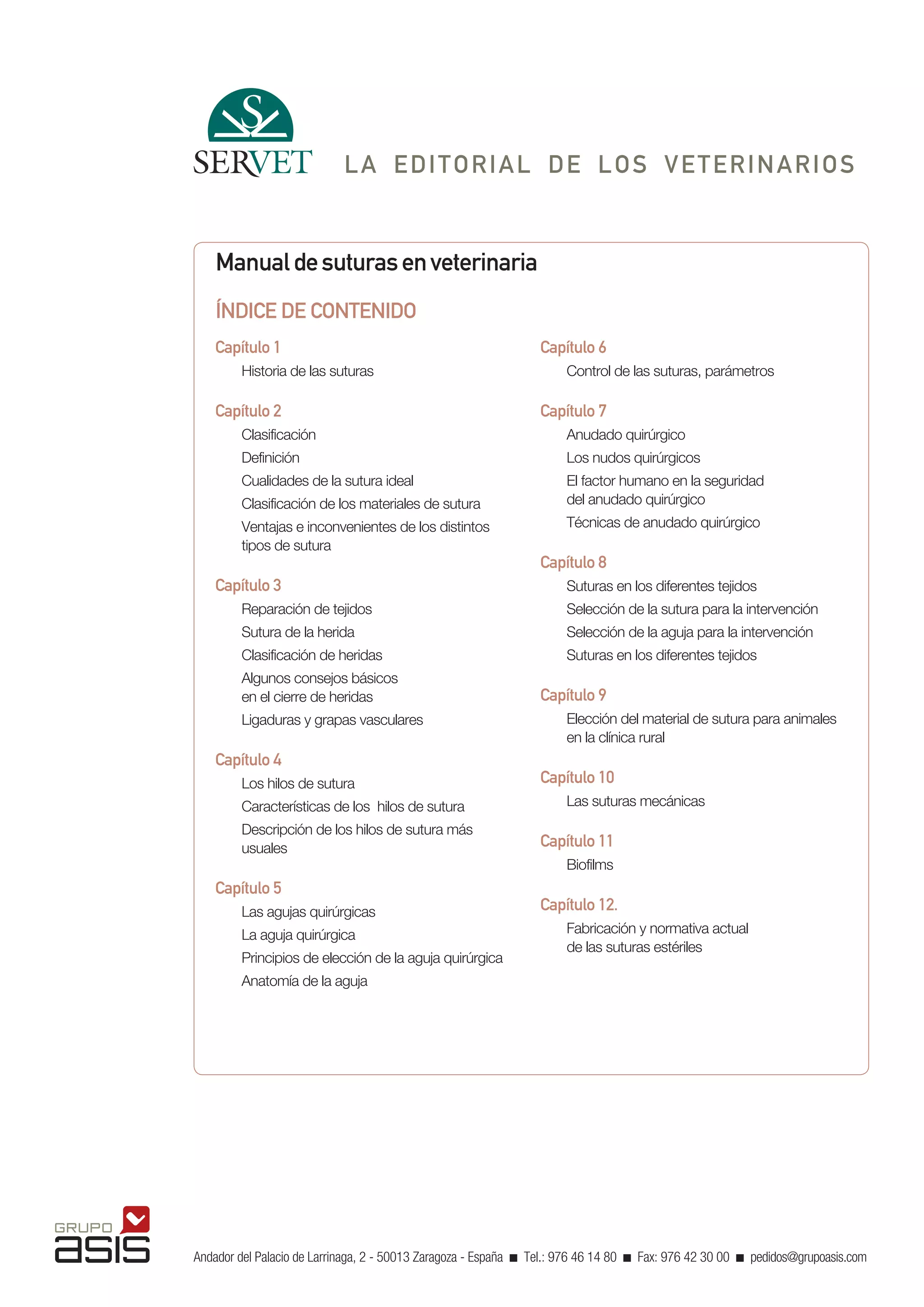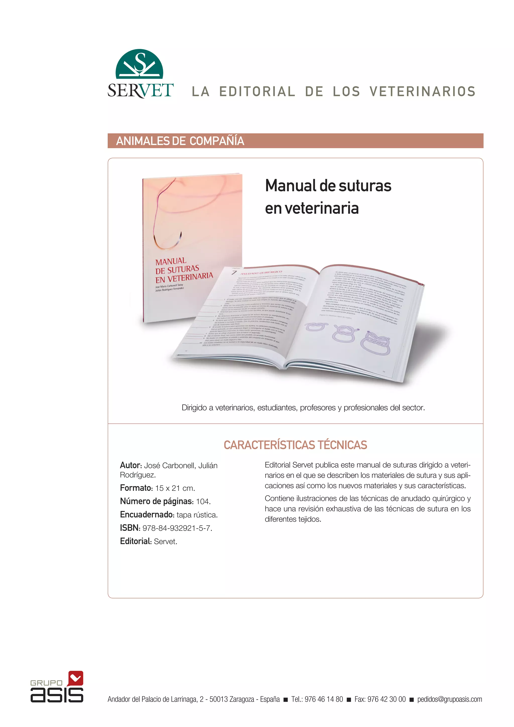 Este documento presenta un manual de suturas en veterinaria. El manual describe los materiales de sutura y sus aplicaciones, así como nuevos materiales y sus características. Contiene ilustraciones de técnicas de anudado quirúrgico y revisa exhaustivamente las técnicas de sutura en diferentes tejidos. El manual está dirigido a veterinarios, estudiantes, profesores y profesionales del sector.