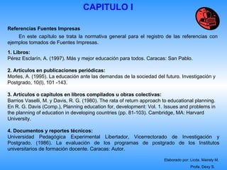 Este documento presenta las normas y recomendaciones para elaborar referencias bibliográficas de fuentes impresas, audiovisuales, electrónicas y para organizar la lista de referencias. Se explican los elementos necesarios para cada tipo de fuente y el orden en que deben presentarse. También se indican criterios de forma como la coherencia, exactitud y consistencia en el uso de abreviaturas y ordenamiento alfabético.