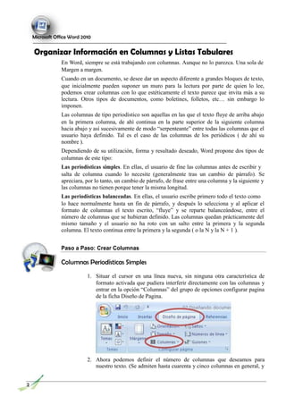 Este documento describe cómo organizar información en columnas y usar letras capitales en Word. Explica cómo crear columnas periódicas simples y balanceadas, insertando saltos de columna. También explica cómo aplicar letras capitales al inicio de párrafos y cómo eliminar formato de columnas. Finalmente incluye ejemplos para que el lector practique estas funciones.