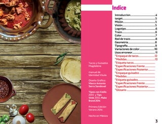 Este manual presenta la identidad visual de la marca "Tacos y Guisados Magdalena". Explica el logotipo, colores, tipografía, diseño de empaques y etiquetas de sus productos (tacos y guisados). El objetivo es establecer lineamientos gráficos que protejan la individualidad de la marca y mantengan una identidad unificada.